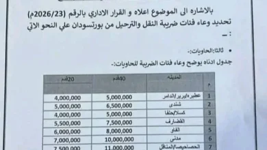 أعلنت الإدارة العامة لضرائب ولاية البحر الأحمر اعتماد فئات جديدة لضريبة نقل وترحيل البضائع من بورتسودان، وذلك بموجب قرار إداري…